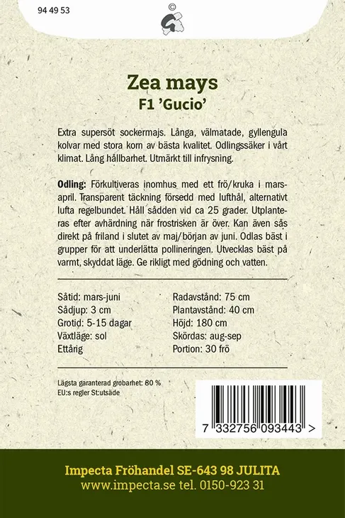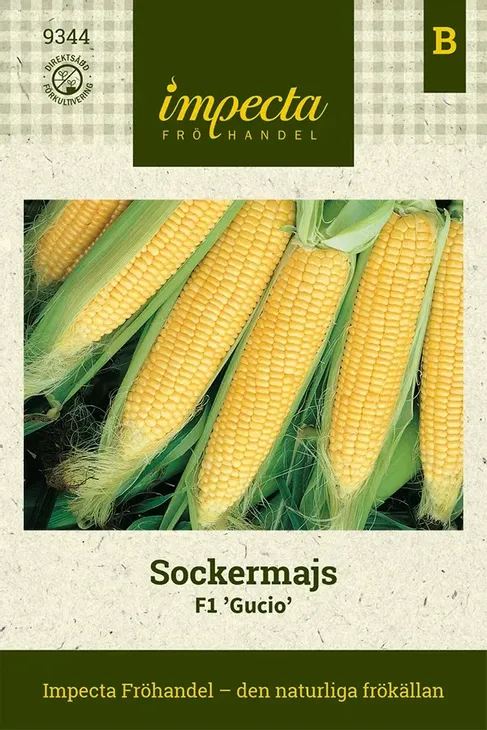 Extra supersöt sockermajs. Långa, välmatade, gyllengula kolvar med stora korn av bästa kvalitet. Odlingssäker i vårt klimat. Lång hållbarhet. Utmärkt till infrysning. Odling från frö: Förkultiveras inomhus med ett frö/kruka i mars-april. Transparent täckning försedd med lufthål, alternativt lufta regelbundet. Håll sådden vid ca 25 grader. Utplanteras efter avhärdning när frostrisken är över. Kan även sås direkt på friland i slutet av maj/början av juni. Odlas bäst i grupper för att underlätta pollineringen. Utvecklas bäst på varmt, skyddat läge. Ge rikligt med gödning och vatten. Portionsmängd: 30 frö Utvecklingstid, dagar: 85 Växtläge: sol Höjd: 180 cm Färg: Gul Såtid: mars-juni Grotid: 5-15 dagar Blomtid/Skördetid: aug-sep Årighet: Ettårig
