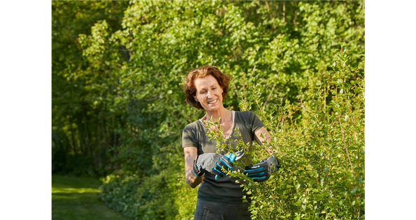 Arbete med tät undervegetation kräver mer lämpliga skyddskläder, till exempel buskhandskar i storlek L från GARDENA. Med hjälp av dessa är det enklare att klippa buskar och arbeta med undervegetation eftersom det robusta materialet i trädgårdshandskarna skyddar händerna från rispor och nässlor. Handsken för stora händer är bra för frekvent användning av redskap som trädgårdssekatörer, eftersom materialet mellan tumme och pekfinger är förstärkt och det här området utsätts vanligen för mer slitage under arbetet. Ytterligare skydd ges av den långa manschetten med spänne, så att handleden och underarmen skyddas.