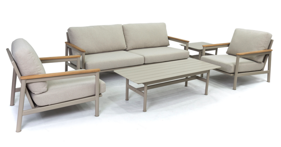 Porto är en modern och mycket robust loungegrupp i en härlig blandning av material. Gruppen är oerhört bekväm tack vare de tjocka dynorna med högdensitetsskum. De är klädda med olefintyg som har en vattenavvisande beläggning på insidan. Stommen består av khakifärgad pulverlackerad aluminium med vackra armstöden i teak. Allt för att stå emot olika väderlekar.